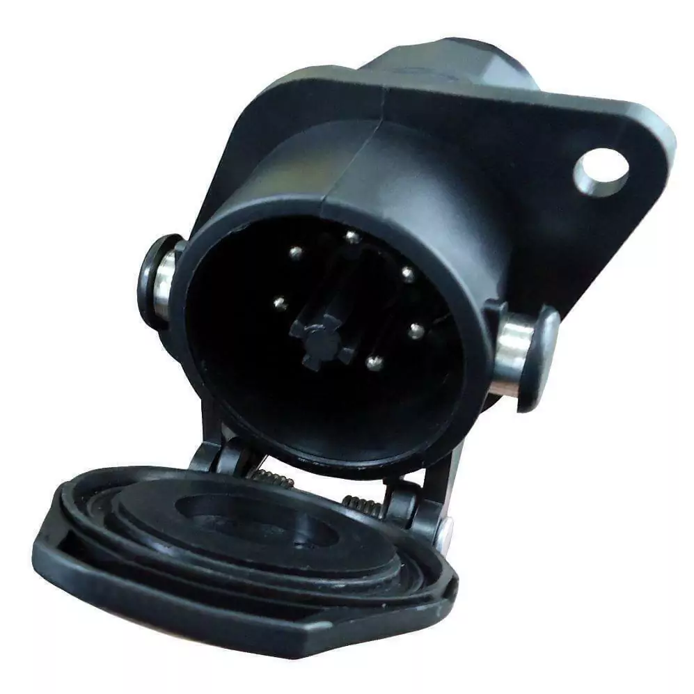 Tomada Elétrica para Engate Redonda 7 Polos - Completa <br><br>Instalação: sistema ABS e rastreador<br><br>Material: Nylon Preto<br><br>Tensão: Bivolt (12V/24V)<br><br>Conexão fixa (Fêmea) e móvel (Macho)<br><br>Tomada de fino acabamento<br><br>Possui gravação de norma DIN, numeração dos terminais<br><br>Dimensões Aproximadas: Fixa: 10 x 13,2 x 9cm Móvel: 7 x 11,7 x 9,5cm <br><br>ISO 7638
